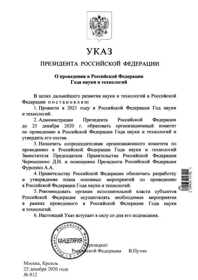 Документ опубликован на официальном портале правовой информации. Цель указа – дальнейшее развитие науки и технологий в Российской Федерации.