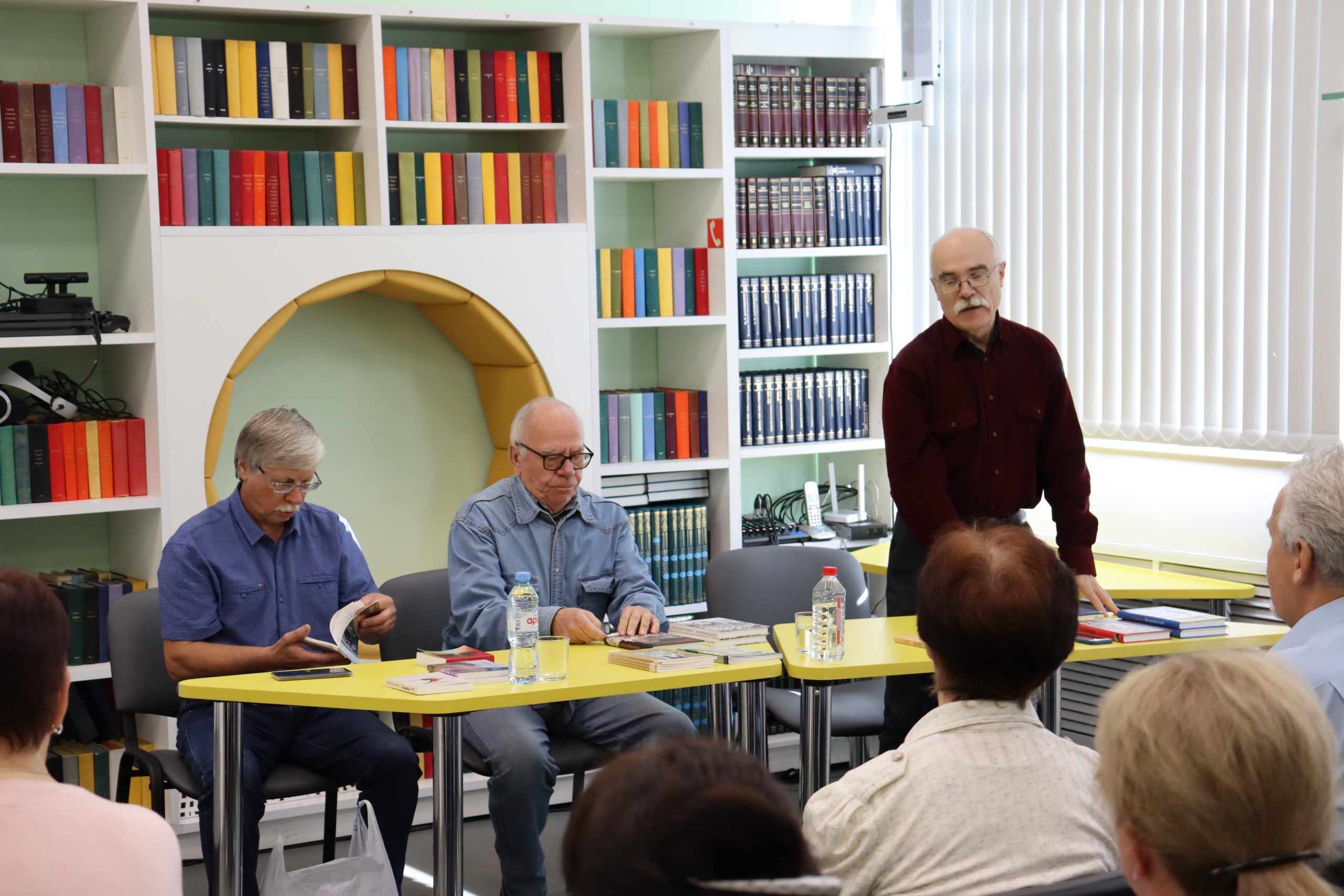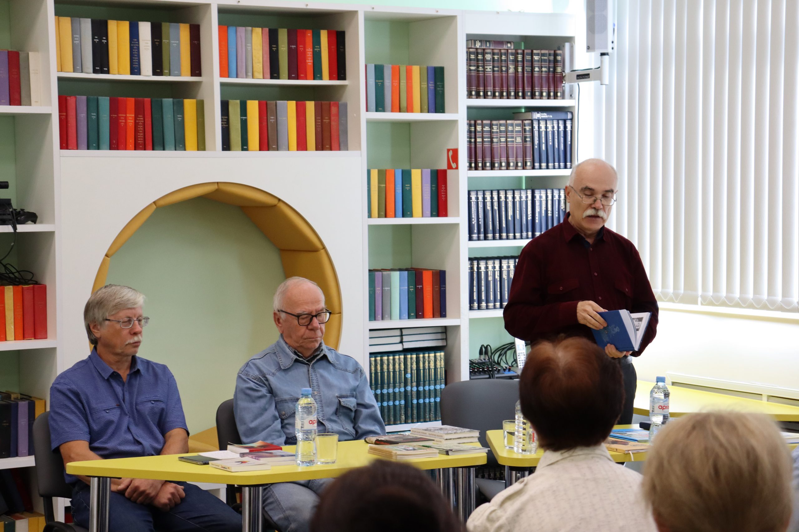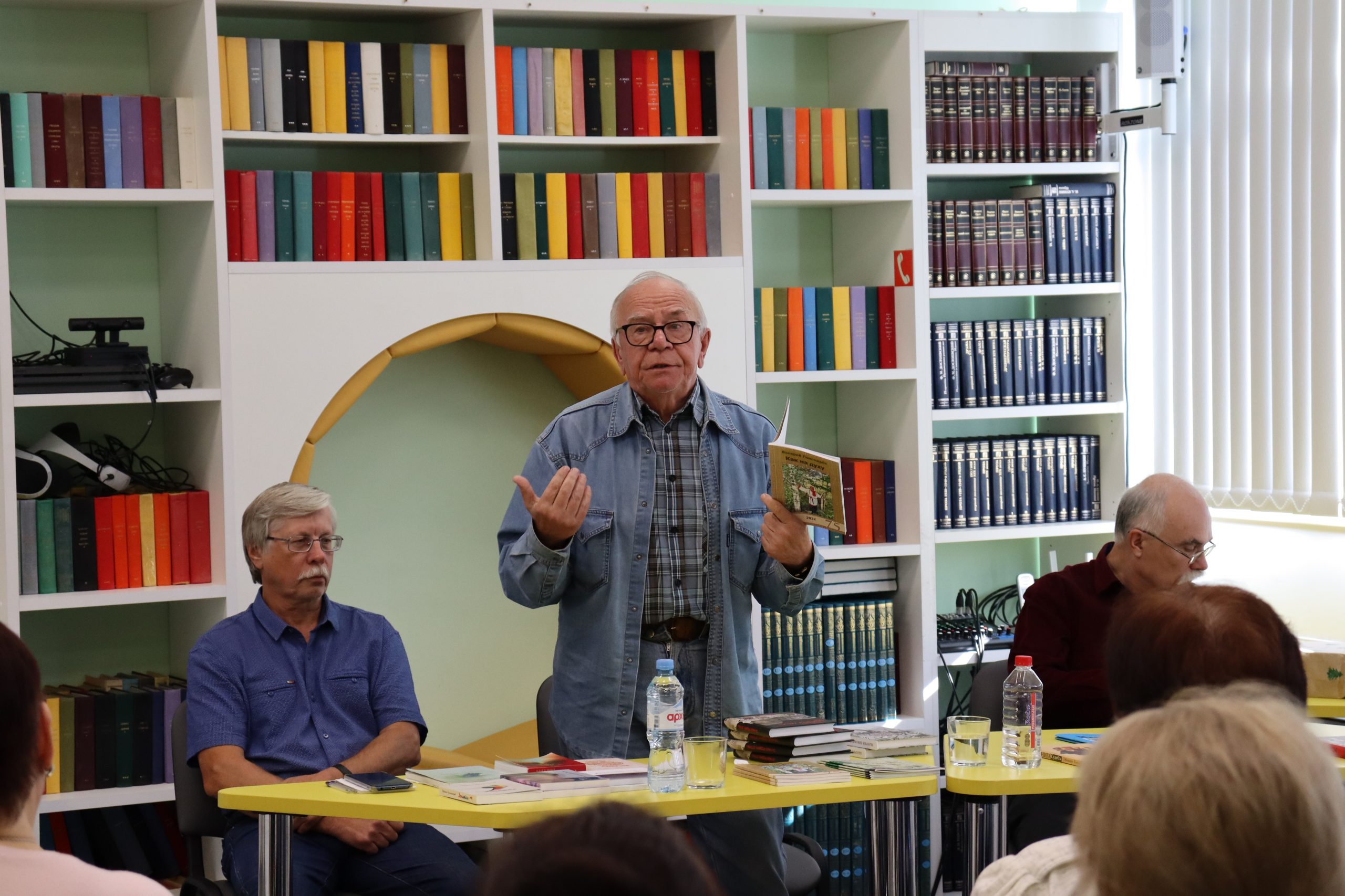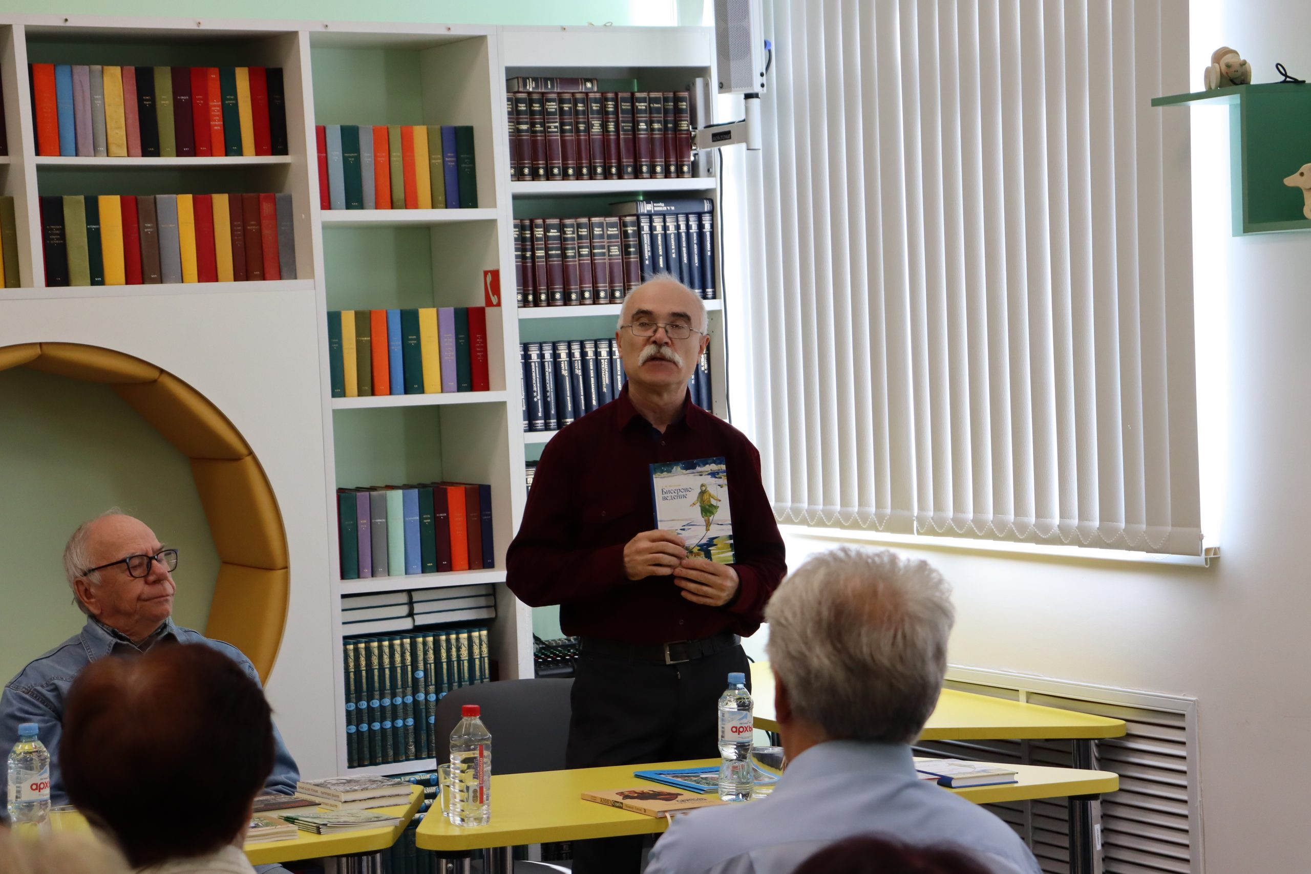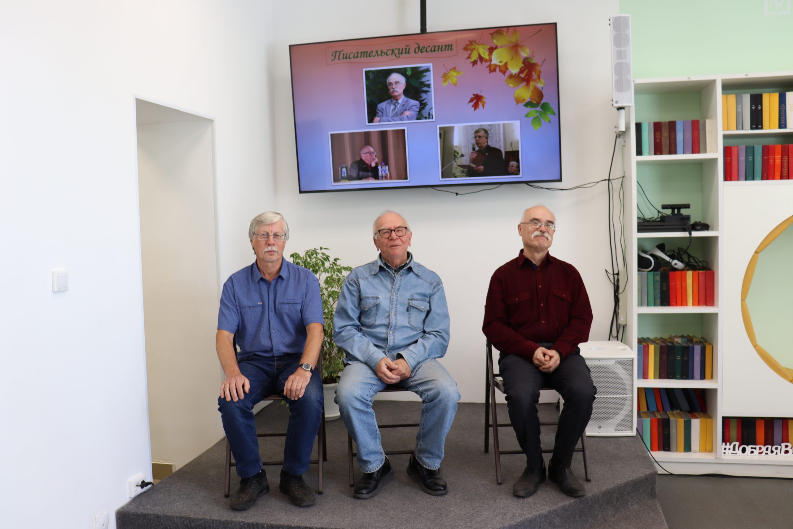 Трио — два прозаика и поэт органично дополняли друг друга. Отменное чувство юмора, открытость и позитив наших гостей передались всем присутствующим. Александр Михайлович Молодцов рассказал о книге «Бисерововедение», удивил историческими фактами ВОВ, вошедшими в книгу. Евгений Александрович Изместьев познакомил со своими стихами. Каждое прочитанное им стихотворение сопровождалось бурными аплодисментами слушателей.