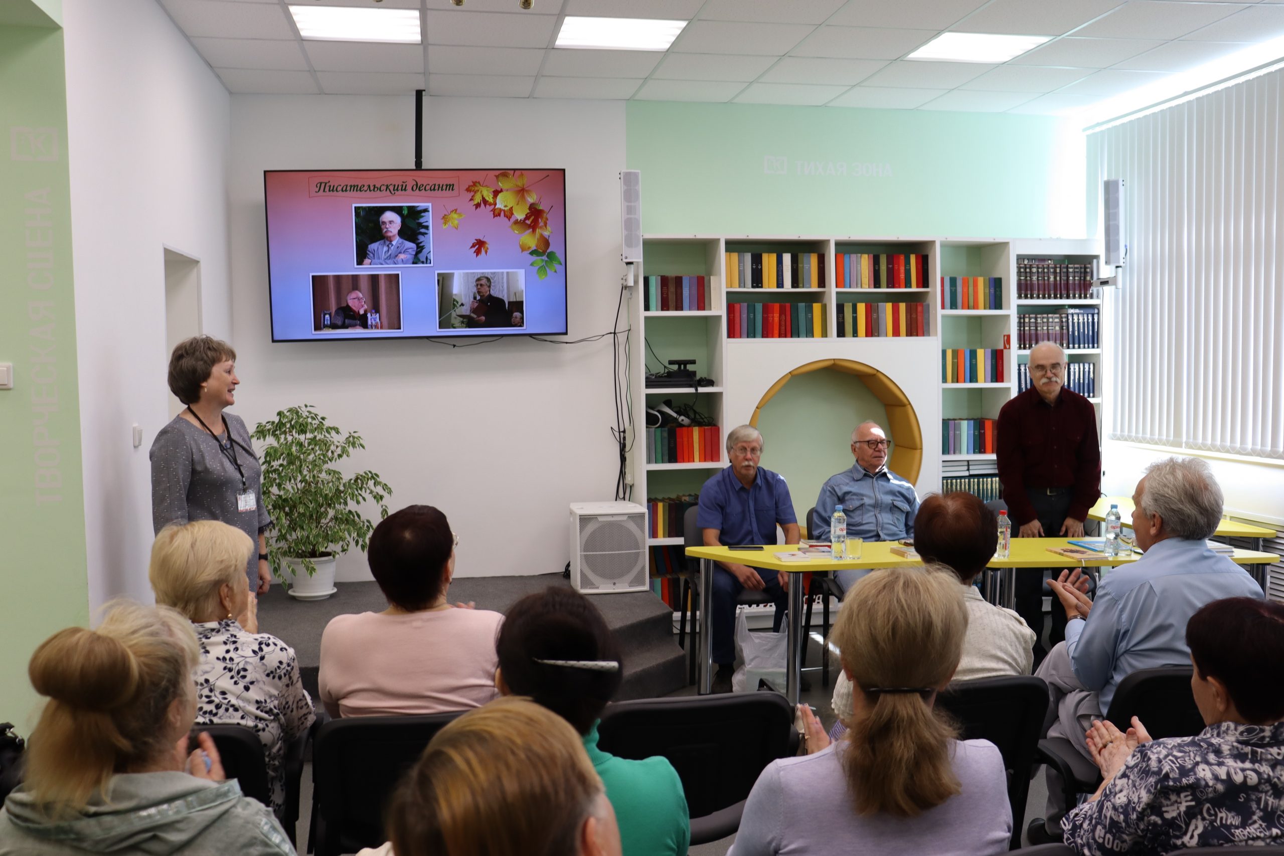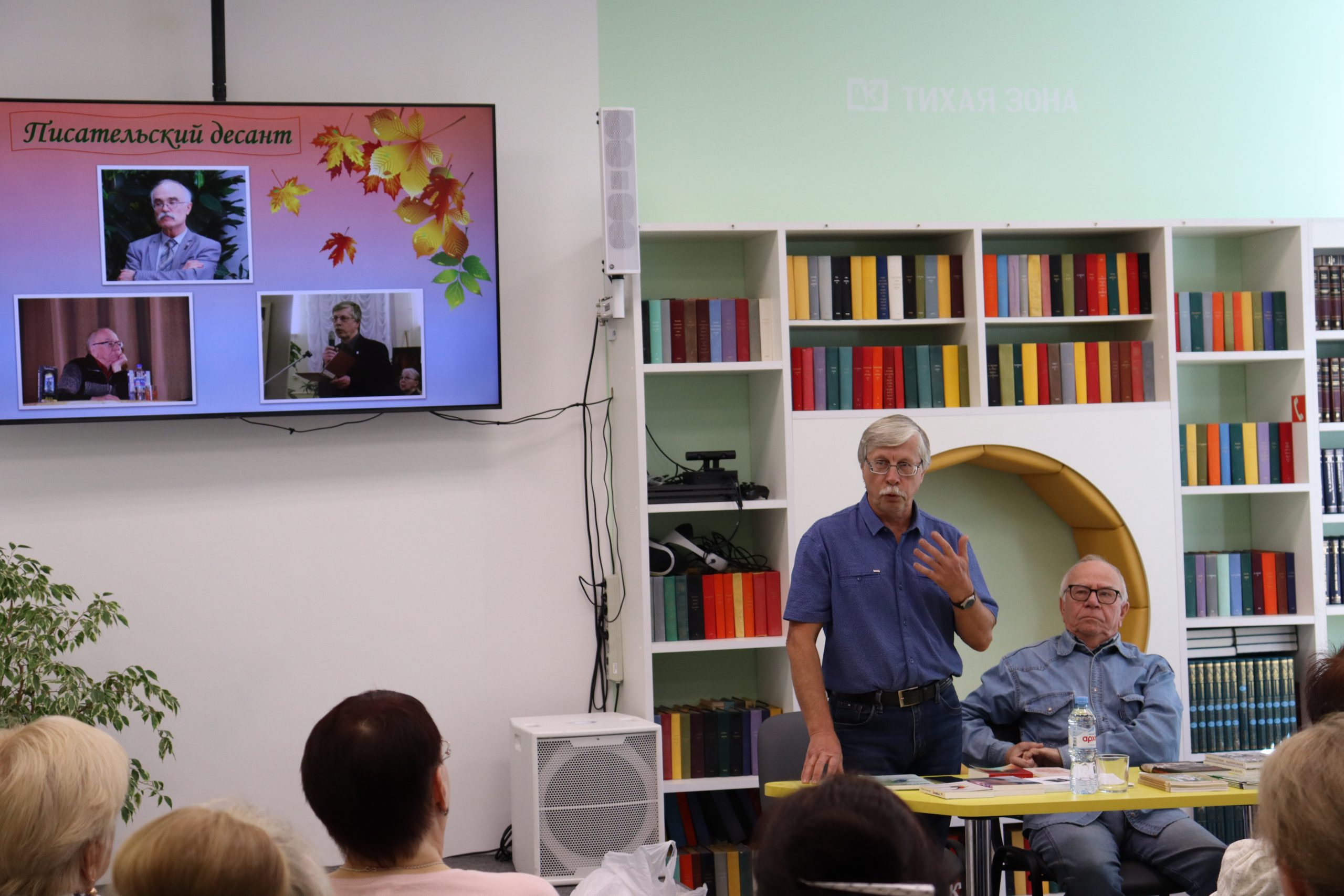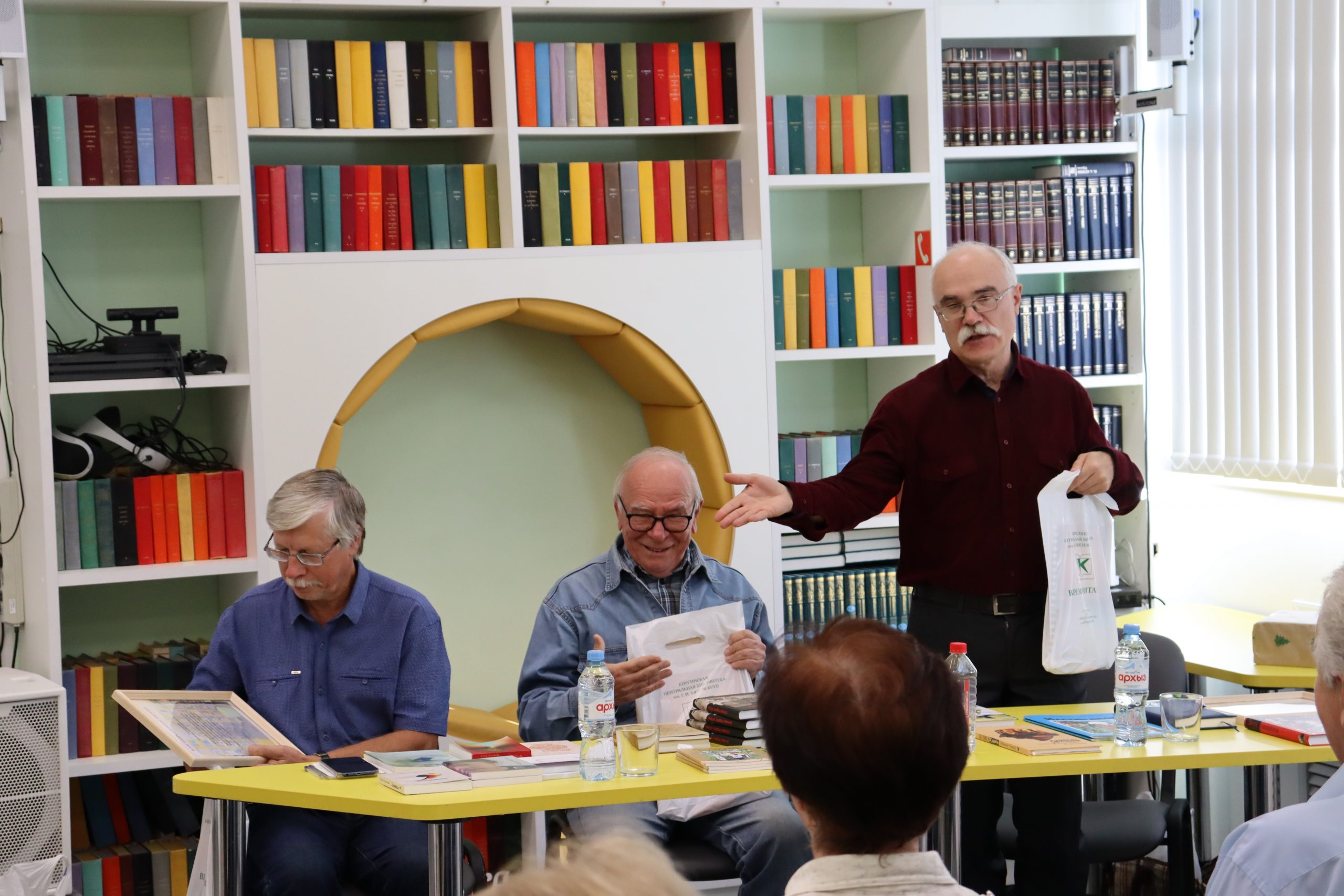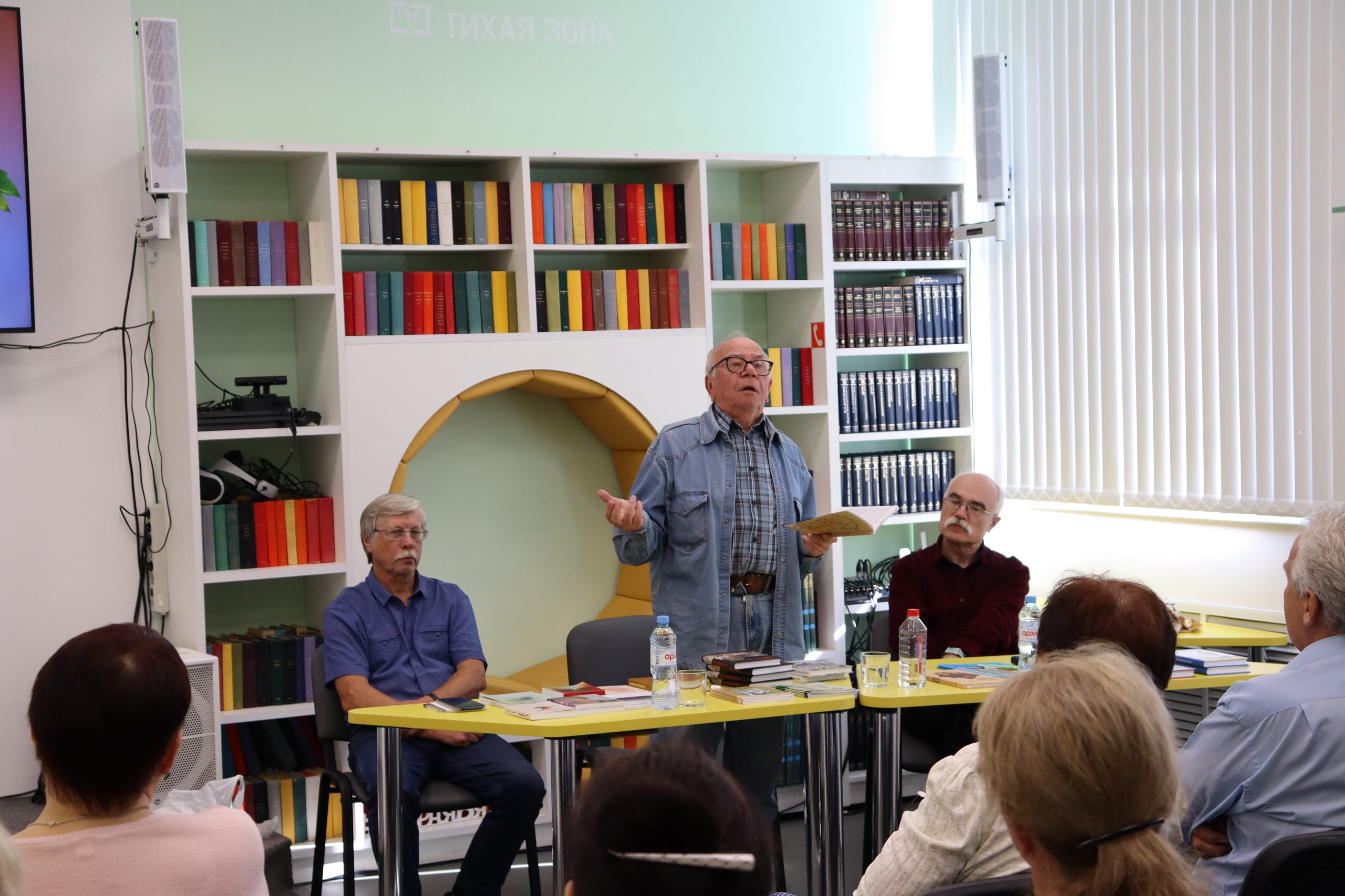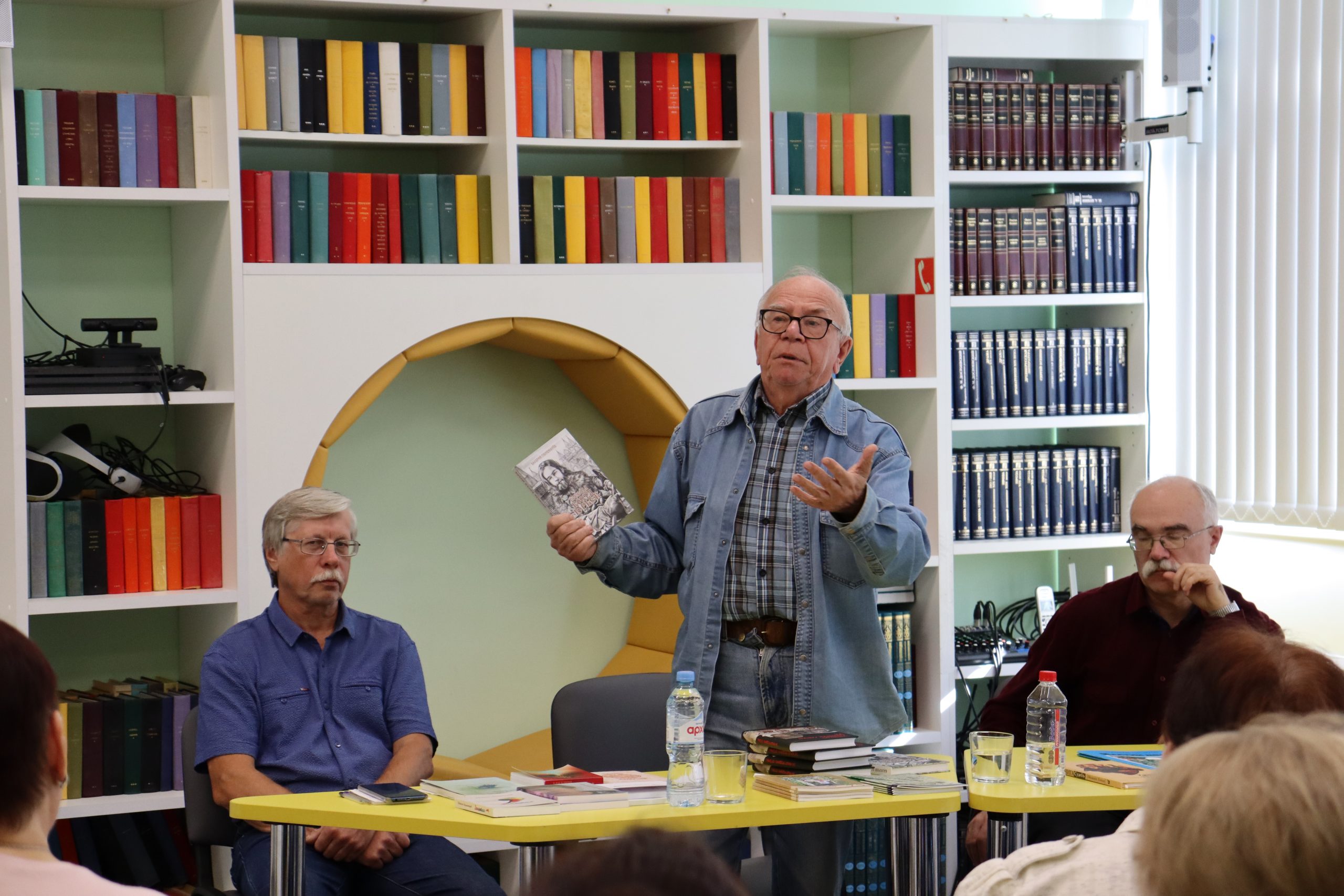 Трио — два прозаика и поэт органично дополняли друг друга. Отменное чувство юмора, открытость и позитив наших гостей передались всем присутствующим. Александр Михайлович Молодцов рассказал о книге «Бисерововедение», удивил историческими фактами ВОВ, вошедшими в книгу. Евгений Александрович Изместьев познакомил со своими стихами. Каждое прочитанное им стихотворение сопровождалось бурными аплодисментами слушателей.
