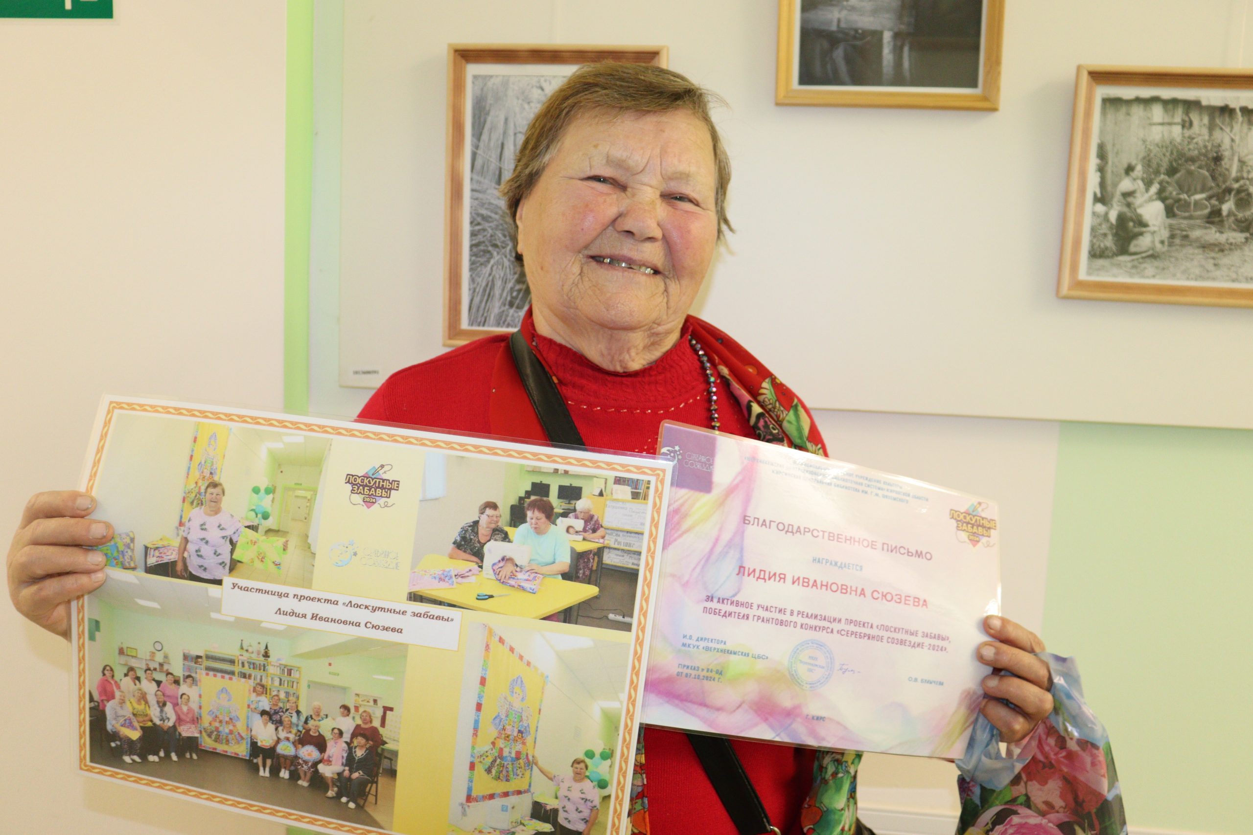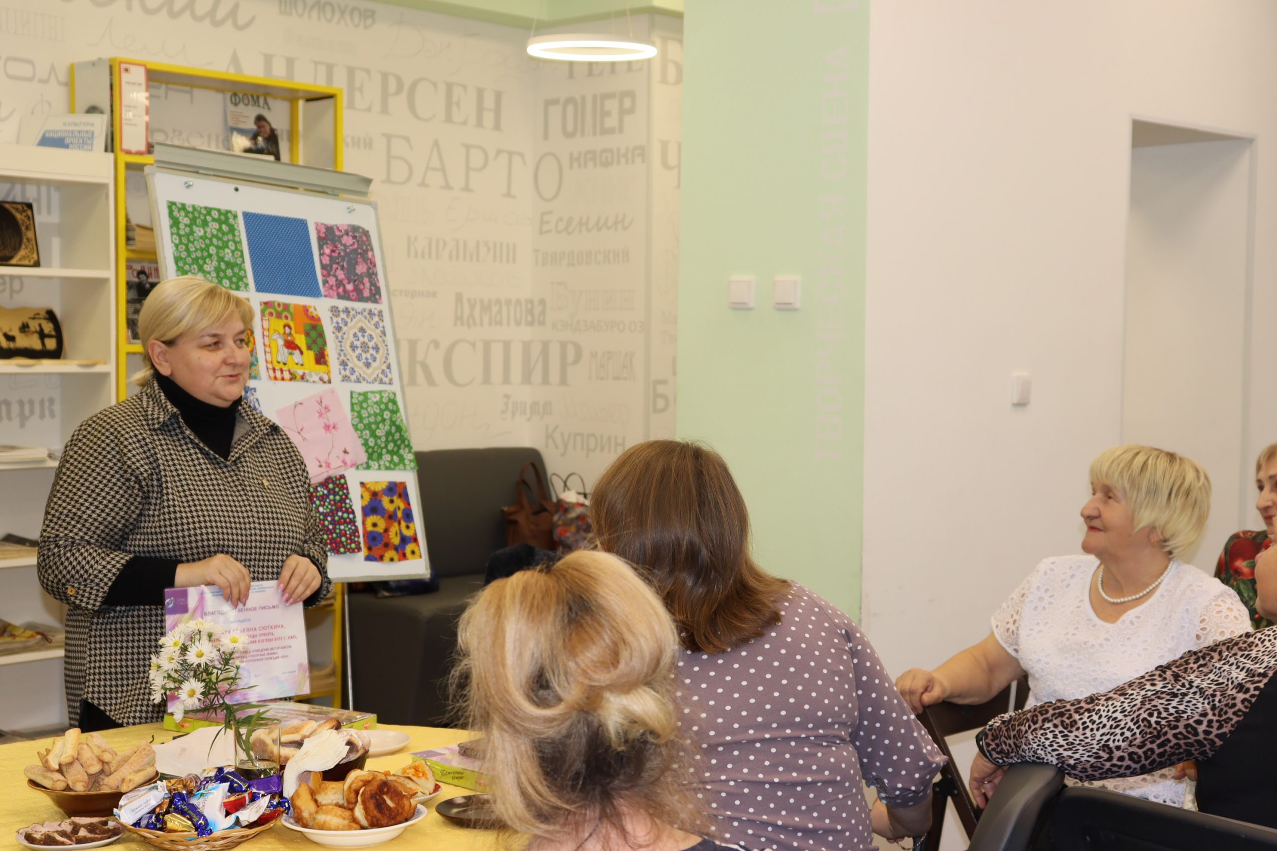 В ходе праздничной программы женщины были отмечены благодарственными письмами за активное участие в реализации проекта. Вспомнили самые яркие моменты совместных занятий и мастер-классов, делились впечатлениями. Отвечали на вопросы ведущего, удивляли присутствующих своими знаниями лоскутного шитья.
