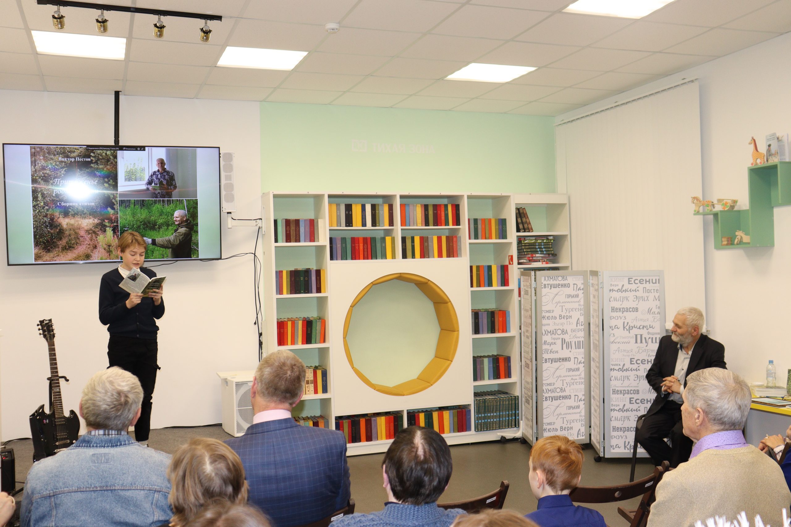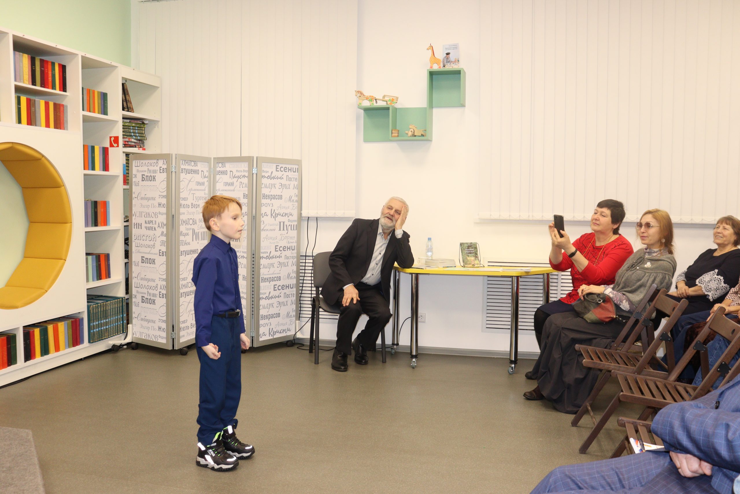 На встрече выступил начинающий поэт Егор Едигарев. Он прочитал для присутствующих одно из стихотворений собственного сочинения «Моя мама». У Егора уже есть своя первая книжка-малышка авторских стихотворений. Украшением вечера стали музыкальные номера в исполнении С. Шулятьевой, С. Осколковой и Г. Костромитинова.