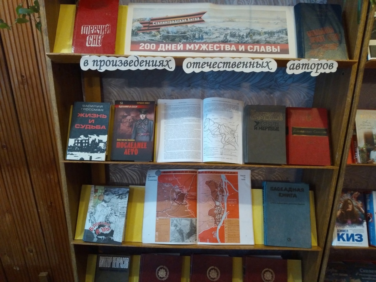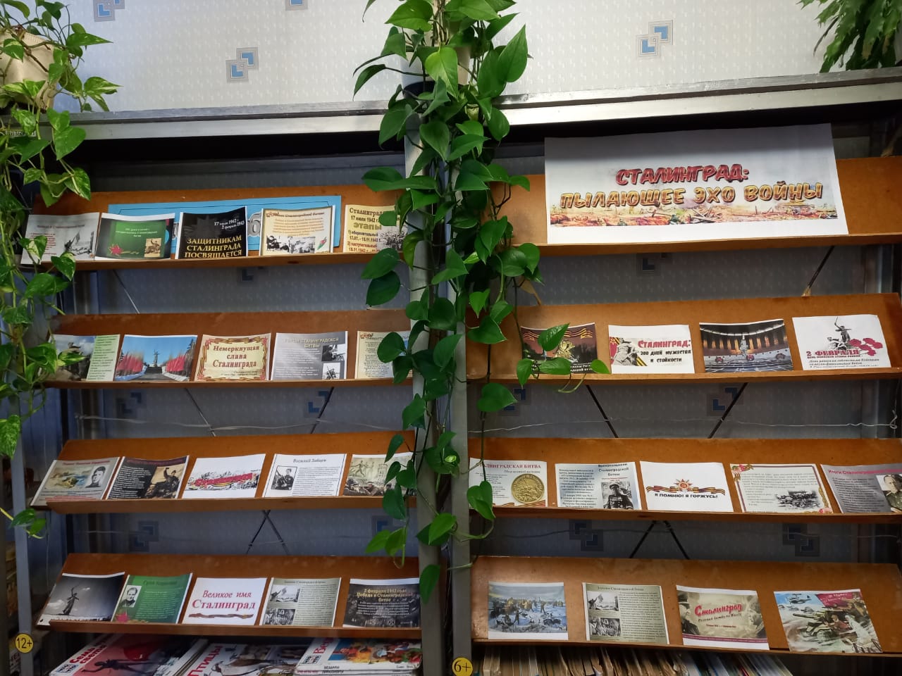 Обзор выставки «Сталинград: пылающее эхо войны» провела для своих пользователей Гарьская СБФ. В Тупрунской СБФ прошел час истории «Сталинградская битва». О героизме и мужестве советских солдат, о «Доме Павлова», в котором в течение 58 дней героически держала оборону группа советских бойцов, рассказали участникам на уроке мужества «Сталинград: 200 дней мужества и стойкости» в Кирсинской ГБФ №2. Для посетителей была показана короткая видеохроника тех лет. Также библиотекарь поделилась своими впечатлениями от посещения Мемориального комплекса «Героям Сталинградской битвы» на Мамаевом кургане.