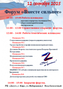 12 сентября 2025 года в РЦ «Досуг» г. Кирс, ул. Набережная, д. 1 пройдет окружной форум «Вместе сильнее».